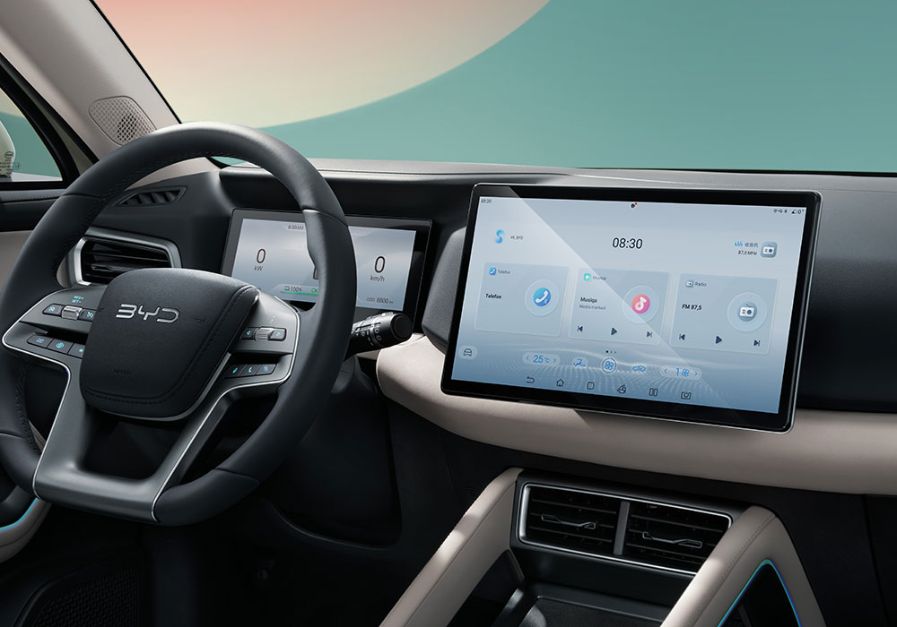 The BYD ATTO 2’s interior is crafted with eco-friendly sleek vegan leather seats and high-quality materials throughout the dashboard and door panels.